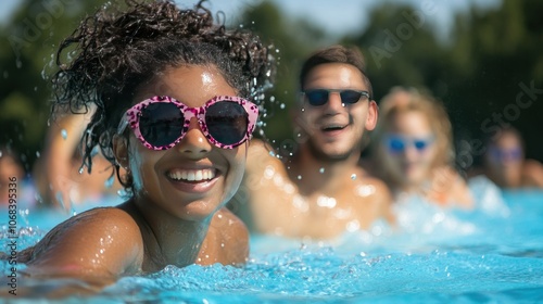 A group of friends enjoys splashing around in an outdoor pool, in the warm sunshine and heat, making their summer vacation a joyful one."