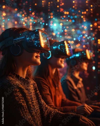 A group of friends in a living room, wearing VR headsets, immersed in a glowing grid of a futuristic virtual world. The scene is vibrant and exciting, ideal for showcasing VR technology.