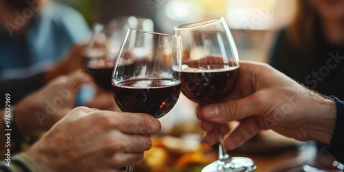A group of friends joyfully toasting with red wine glasses, celebrating a special occasion with laughter and togetherness, capturing the essence of friendship and happiness.