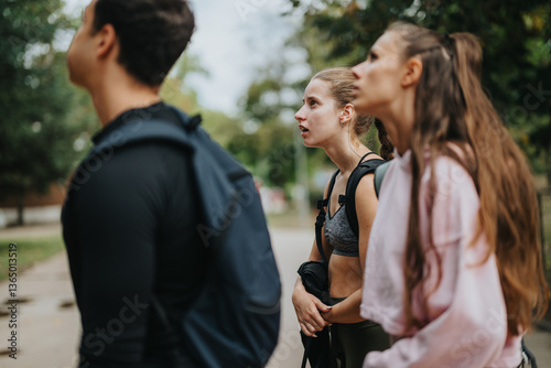 A group of friends participating in fitness activities in a park during a cloudy day, emphasizing community and active lifestyles.