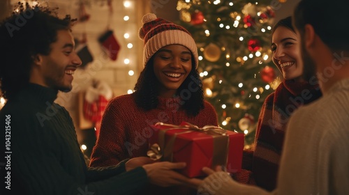 A group of friends standing around a Christmas tree, exchanging gifts and smiling, with festive decorations and soft holiday lighting in the background