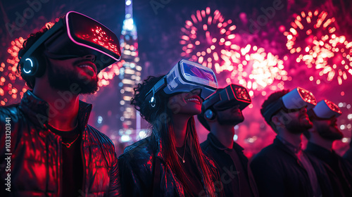 A group of friends wearing VR headsets, celebrating the New Year with fireworks in the background
