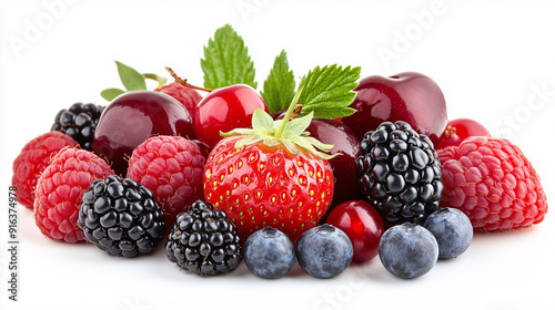a group of fruits strawberry, raspberry, blackcurrant, blackberry and cherry, blue berry, white background