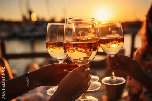 A group of girlfriends raise a toast with glasses of white wine on a sunset, Close shot