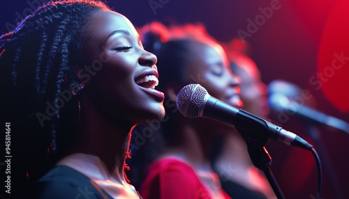 A Group of Gospel Singers in Joyful Harmony on Stage with Vibrant Lighting