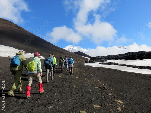 A group of hikers on black ash next to a lava field and snow in in Kamchatka, Russia