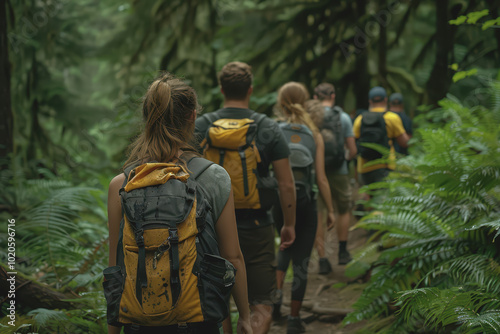 A group of hikers treks along a lush forest path. Explore the wonders of nature in summer.