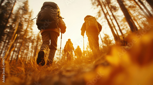 A group of hikers ventures through a sun-drenched forest, capturing the spirit of exploration. The glowing golden light outlines their determined strides.