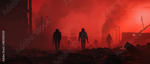 A group of individuals in a somber, post-apocalyptic setting, walking through ruins under a red-lit sky, evoking a sense of mystery and resilience.