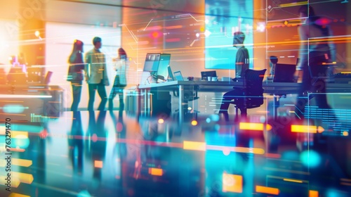 A group of individuals standing around a table engaged in conversation and collaboration in a modern office setting