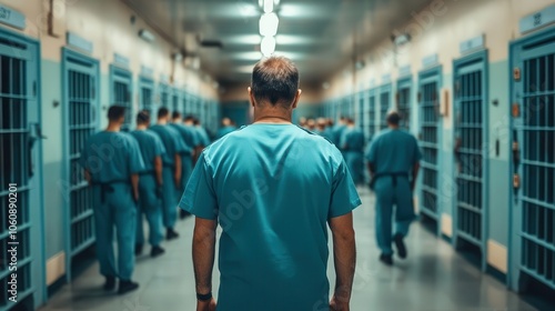 A group of inmates in blue uniforms walk down a prison corridor, viewed from behind. The image suggests confinement, uniformity, and the stark reality of incarceration.