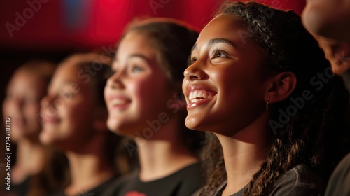 A group of joyful children singing together on stage.
