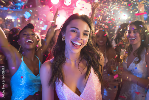 A group of joyful women celebrating at a lively party with confetti, bright lights, and drinks, all smiling and enjoying the festive atmosphere