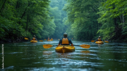 A group of kayakers paddling down a scenic river, with lush green forests lining both sides.