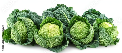 A group of leafy green cabbage heads, a staple food and produce, arranged together on a white background