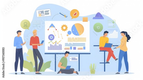 A group of marketers brainstorming a new campaign, sharing ideas and creating strategies, innovative and dynamic