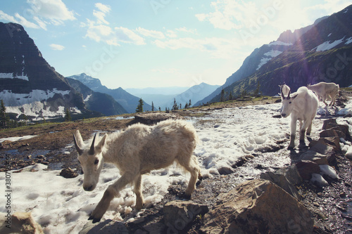 A group of mature and young mountain goats passing through the beautiful, snowy mountain landscape of Glacier National Park, Montana.