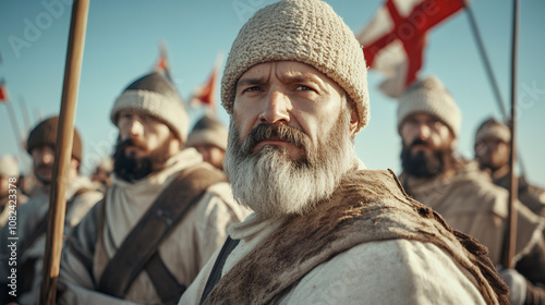 A group of medieval warriors in armor, prepared for battle under a clear sky