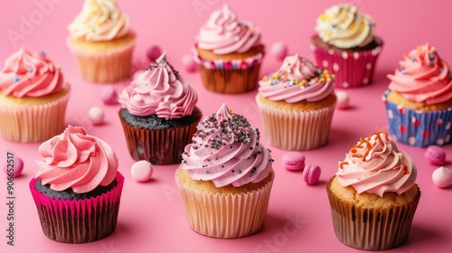 A group of nine chocolate cupcakes decorated with various colors and styles of frosting and sprinkles, isolated against a light pink background.
