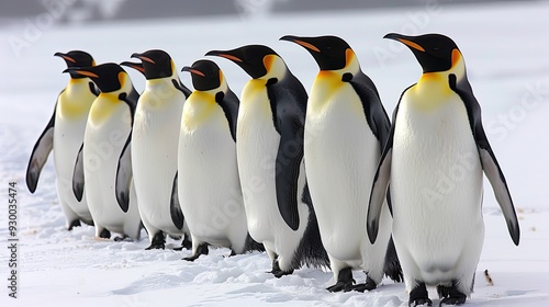 A group of penguins are standing in the snow