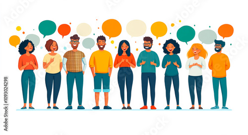 A group of people are standing in a line and are smiling. The people are wearing different colored shirts and pants. Scene is happy and friendly