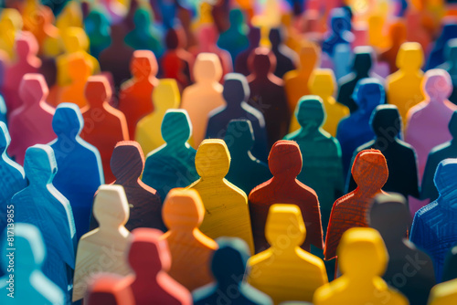 A group of people are standing in a line, with some of them wearing red and others wearing blue. The people are all different sizes and shapes, and they are all lined up in a row