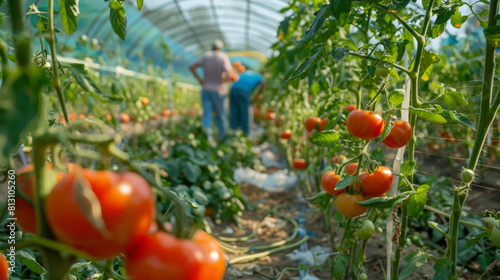 A group of people are working in a greenhouse, picking and sorting tomatoes
