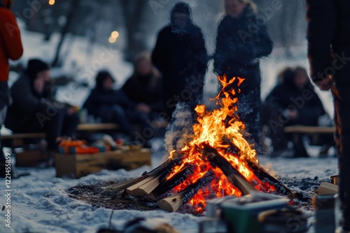 A group of people gathered around a warm fire in snowy surroundings, perfect for cold winter scenes or camping themes