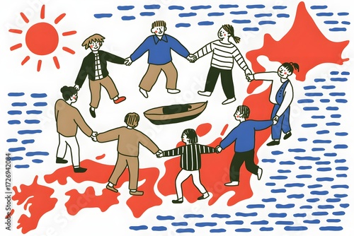 A group of people holding hands, circling a boat in an illustrated scene symbolizing unity and collaboration. The image features a red sun and outline of lands with the sea