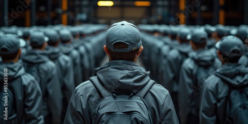 A group of people in identical gray uniforms stand with their backs in a large hall.