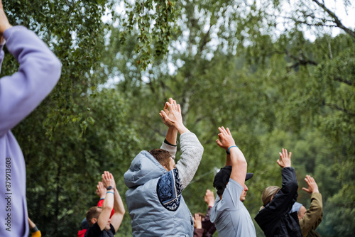 A group of people is seen engaging in outdoor recreational activities in a circle, raising their hands in the air. They seem to be having a good time in a natural setting