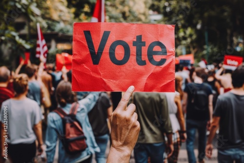 A group of people marches while holding a red sign that says "Vote," advocating for electoral participation and civic engagement.