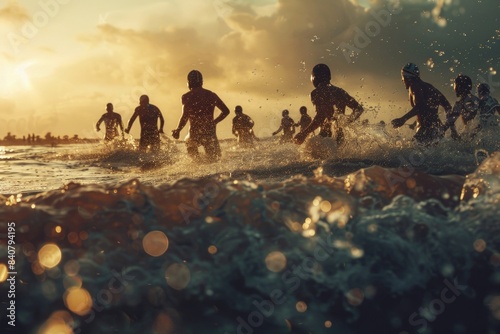 A group of people sprinting towards the ocean's shore, with waves crashing in the background
