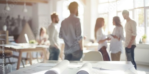 A group of people standing around a table with papers on it. AI.