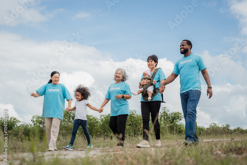 A group of people wearing blue shirts are walking together. The group includes a man. environment, clean, wind turbine, volunteer, community, teamwork, social, care, nature