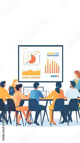 A group of people working together in front of a screen, with vector illustrations and a flat design style, against a white background