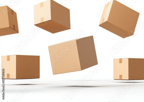 A group of product boxes order falling with shadows. Marketplace and transport. White background. Business e-commerce online shopping concept.