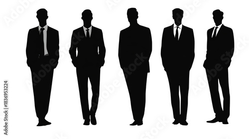 A group of professional silhouettes in suits standing confidently. Ideal for representing teamwork, business presentations, or corporate success in various industries.