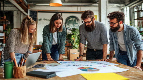 A group of professionals collaborating on a project with charts and a laptop on a table.