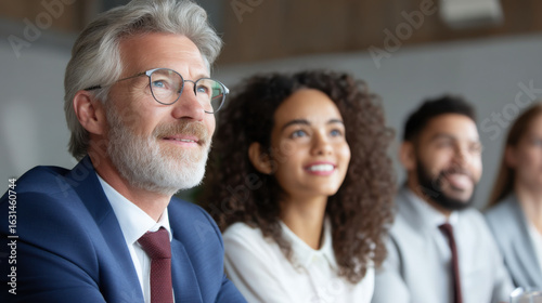 A group of professionals engaged in a meeting, showcasing a diverse range of expressions and attire that exude confidence and attentiveness.