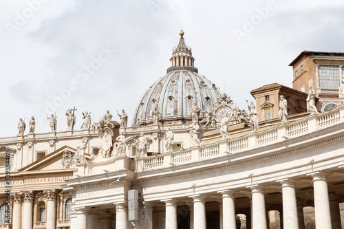 A group of Saint Statues on the colonnades of St Peter's Square with dome in Vatican City, Rome, Italy