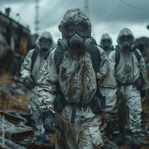 A group of scientists in special suits during a deadly virus pandemic or after a nuclear strike. The concept of the post-apocalyptic world.