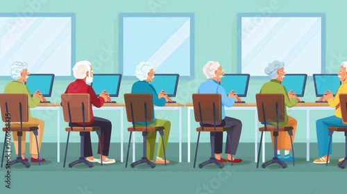 A group of senior citizens actively participates in computer courses, using laptops and desktops to enhance their digital skills. Generative AI