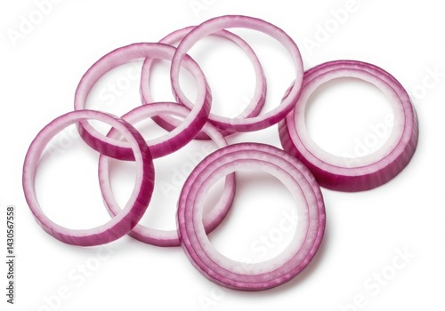 A group of sliced red onion rings arranged in a pile together isolated on white background