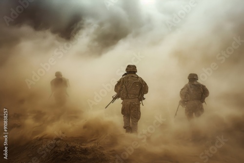 A group of soldiers dressed in military attire walking purposefully through a foggy field, Soldiers in a desert storm, facing harsh weather and challenging combat conditions, AI Generated
