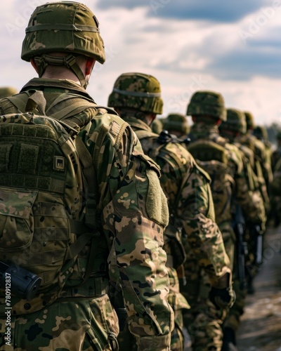 A group of soldiers in camouflage uniforms walking down a road. Generative AI.