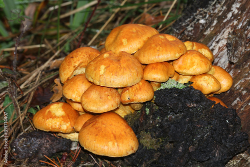 A group of Spectacular Rustgill Mushrooms, Gymnopilus junonius, growing in woodland in the UK.