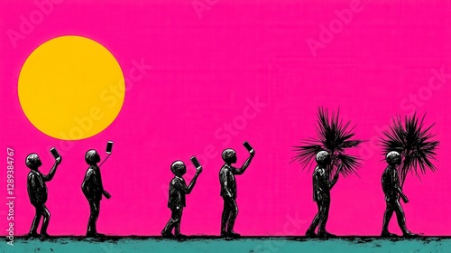 A group of stylized figures walking with smartphones under a vibrant pink sky and a large yellow sun