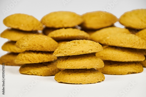 A group of sugar cookies are neatly stacked on top of each other on a white background..Close-up