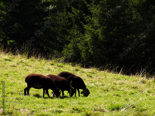 A group of three black grazing sheep. A green pasture in the Swiss mountains.